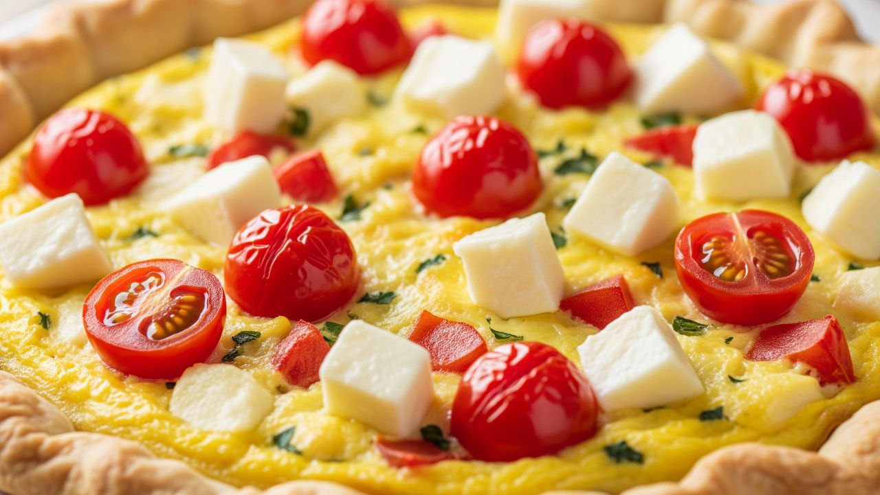 Пирог с моцареллой и помидорами черри: Добавьте в начинку кусочки свежей моцареллы и разрезанные пополам помидоры черри.